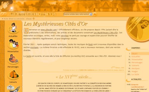 Créé en 1996 par Gwenaël Longo, et largement mis à jour depuis, ce site officiellement officieux des Mystérieuses Cités d'Or est une mine d'informations à propos de la fameuse série qui a scotché de nombreux gamins (dont moi, je dois l'avouer) devant leur télé dans les années 80.