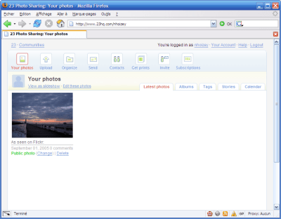 23, un nouvel acteur du domaine, est une alternative possible pour ces futurs ex, et semble avoir bien copié sur Flickr toutes les fonctionnalités qui en ont fait le succès. Malheureusement, il ne marche pas. L'inscription se passe bien, oui, mais ensuite, ce n'est que bug sur bug, et il est très difficile d'uploader une photo. Je n'ai réussi qu'au bout de 4 essais, aucun message d'erreur explicite n'ayant été fourni pour expliquer l'échec… Certains éléments d'interfaces sont de plus bien mal présentés, et on ne trouve pas tout de suite les éléments qui semblent pourtant évidents.