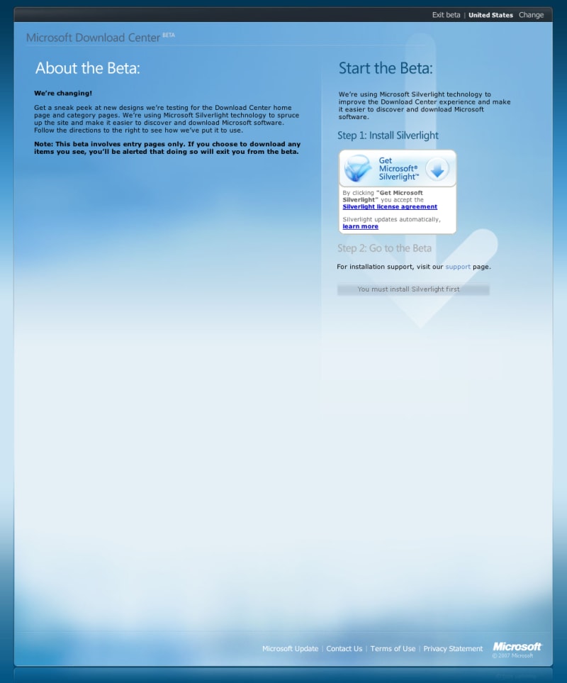 Comme le montre cette version beta du futur site de téléchargement de logiciels de Microsoft, il va bientôt falloir installer dans son navigateur un plugin propriétaire de Microsoft (Silverlight) pour télécharger des logiciels Microsoft.