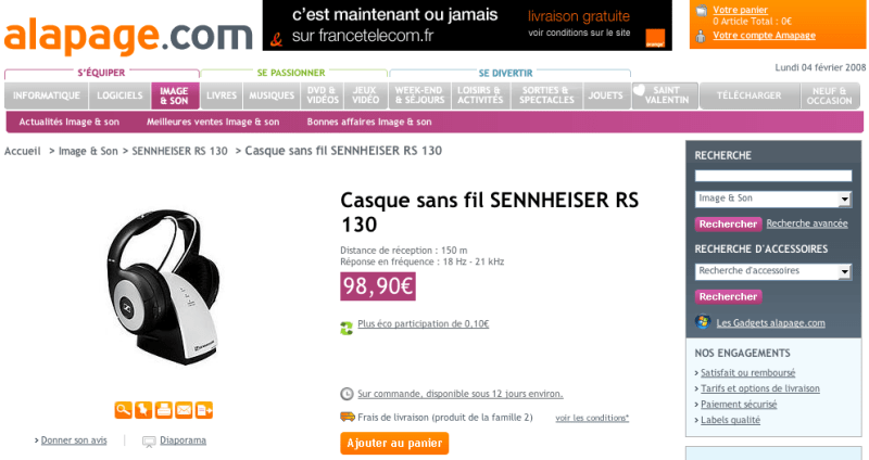 Alapage — une filiale de France Télécom — est un site de vente en ligne relativement important, et qui existe depuis déjà longtemps. Il propose comme la plupart des autres vendeurs généralistes multimédia une panoplie assez large de produits, et c'est chez eux que j'avais trouvé avant noël un casque sans fil Sennheiser RS 130 que je souhaitais acheter, pour plus de 30% moins cher que chez les autres :