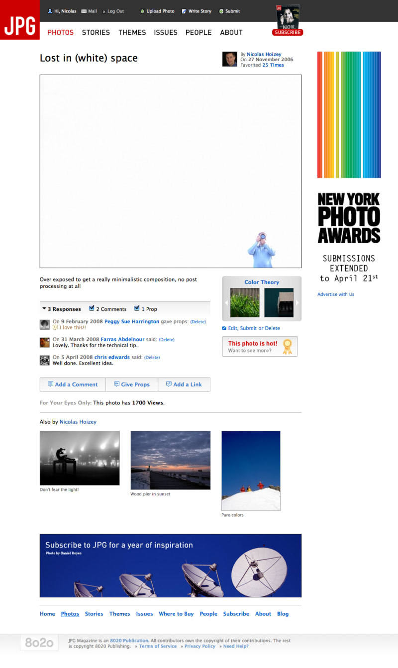 Comme je tente de le montrer sur cette récente nouvelle version de Gastero Prod avec une rubrique dédiée, je m'essaie depuis quelque temps à la photographie, et je dois avouer que tous les petits signes d'intérêt pour mes « œuvres » me font rudement plaisir. J'ai eu ainsi le bonheur de découvrir aujourd'hui que ma photo Lost in (white) space fait partie de la sélection « hot » du thème Color Theory de JPG Magazine.