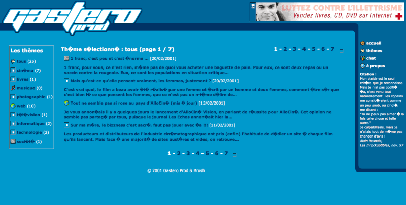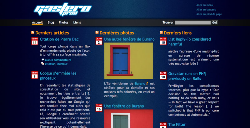 Mais on peut sans doute dire que la première version de Gastero Prod, lancée sur l'hébergement gratuit de Free fin 1999 à l'adresse gasteroprod.free.fr était un blog, sachant qu'il s'agissait d'une liste anté chronologique d'articles regroupés dans des thèmes, non ? La Wayback Machine n'en a malheureusement aucune trace, il faut attendre le passage sur le domaine dédié gasteroprod.com pour qu'elle commence a en avoir une trace le 20 février 2001.