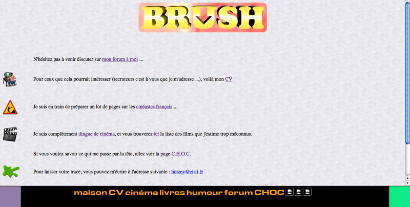 Mais plein de choses délicieuses, tant niveau contenu dont ma 7ème mare aux grenouilles dédiée aux réalisateurs de cinéma français que j'aimais et aime toujours, que niveau technique comme des frames, dont certaines avec un fond dont la couleur changeait cycliquement via du JavaScript, et surtout un vrai forum, alors développé en CGI avec des scripts shell, avant l'adoption rapide de PHP et le lancement du projet libre phpMyChat… ↩︎