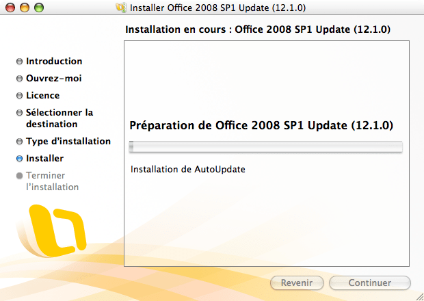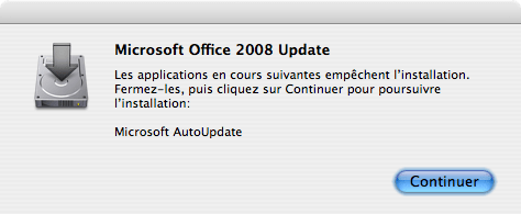 J'ai en effet eu l'amusante surprise de découvrir que la première chose que tente d'installer le Service Pack 1 de Microsoft Office:mac 2008, c'est AutoUpdate, dont je ne vous ferais pas l'affront de décrire la fonctionnalité :