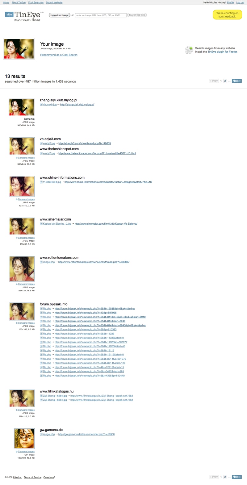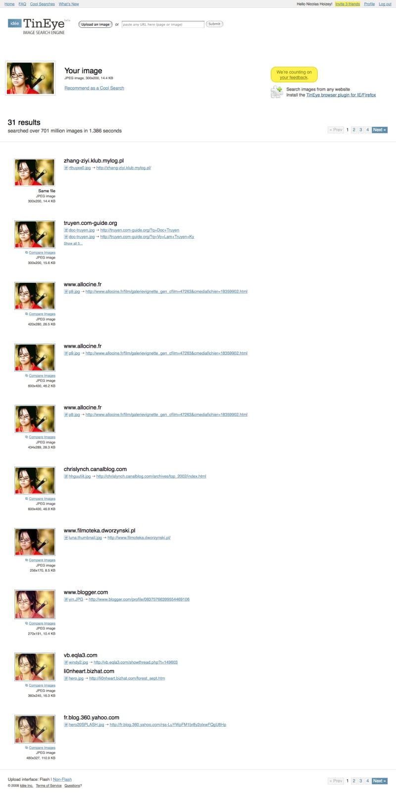 Vous vous souvenez peut-être que je vous ai parlé de TinEye, un système bluffant de reconnaissance d’images sur Internet, il y a quelque temps. Et bien le service a largement complété sa base d'images indexée, annonçant 701 millions d'images contre 487 millions il y a deux mois. La preuve en images.