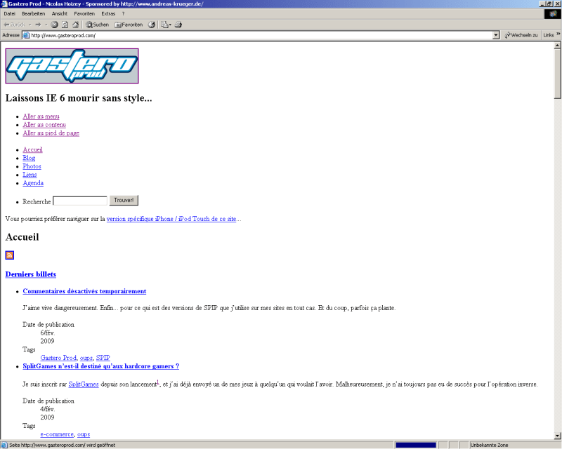 Bon, il faut dire que malgré mes nombreuses tentatives pour faire fonctionner convenablement ce site dans IE6, au prix de quelques poignées de touffes de cheveux, ce n'était toujours pas ça, avec des éléments de contenu qui se baladaient n'importe où dans la page, voir même qui se déplaçaient lors de leur survol par le curseur de la souris, et ce sans aucun code JavaScript !