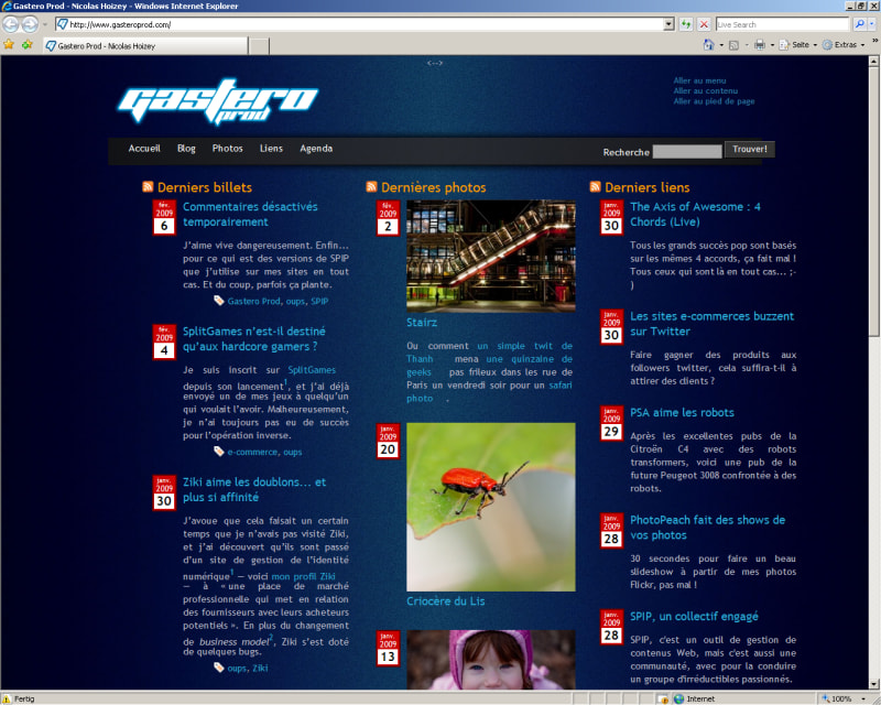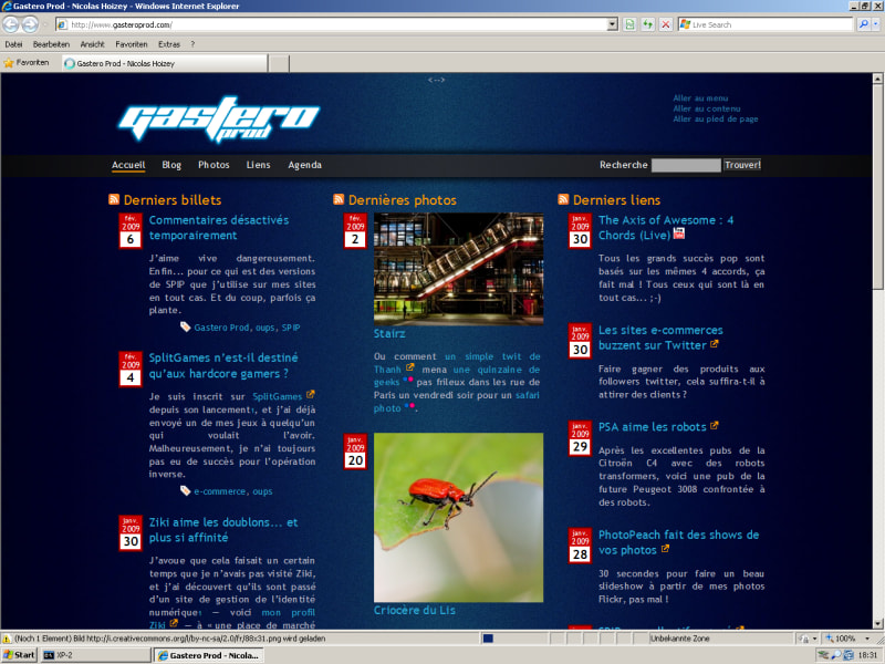 Et je passe sur le fait que le design soit quand même légèrement explosé dans IE7, je ne sais pas si je vais faire beaucoup d'efforts sachant que IE8[1] pointe le bout de son nez et devrait — même s'il semble que ce ne soit pas aussi bien qu'espéré — mieux se comporter.