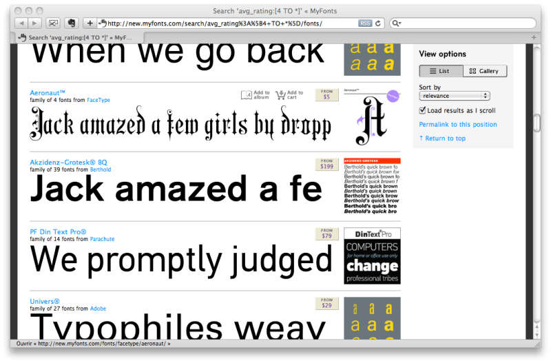 Plus bas dans la page de recherche de MyFonts. Le bloc « View options » s'ancre en haut de la fenêtre si on descend dans la page.