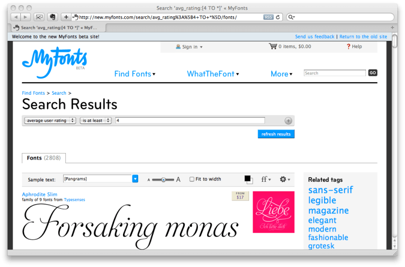 Haut de la page de recherche de MyFonts. Le bloc de paramétrage de la recherche est à droite, sous celui présentant les tags. Dommage qu'il ne soit pas tout de suite visible.
