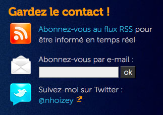 J'ai donc ajouté un bloc « Gardez le contact ! » au début de la colonne de droite, avec bien visibles le lien vers le flux RSS global[1], une possibilité de s'abonner pour plutôt être informé des nouveautés par e-mail[2], et enfin le lien vers mon compte Twitter qui reprend lui aussi les liens vers mes contenus[3] :