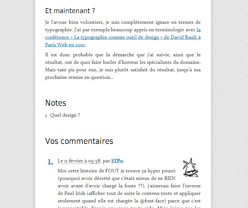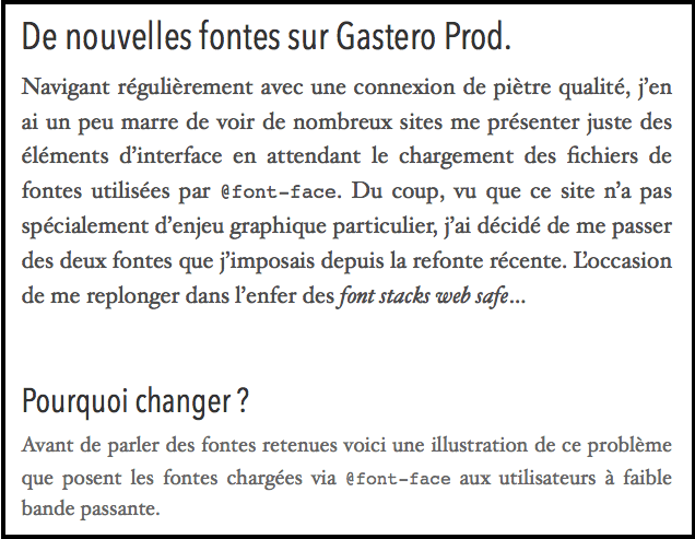 . Du coup, vu que ce site n'a pas spécialement d'enjeu graphique particulier, j'ai décidé de me passer des deux fontes que j'imposais depuis la refonte récente. L'occasion de me replonger dans l'enfer des font stacks web safe…