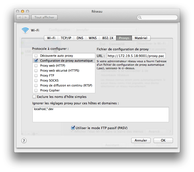 pour configurer automatiquement le proxy fait ignorer complètement la liste d'adresses et domaines pour lesquels il faudrait ignorer cette configuration, comme l'indique l'article « Mac OS X: Bypassing proxy settings for specific IP addresses » de la base de connaissance Apple :
