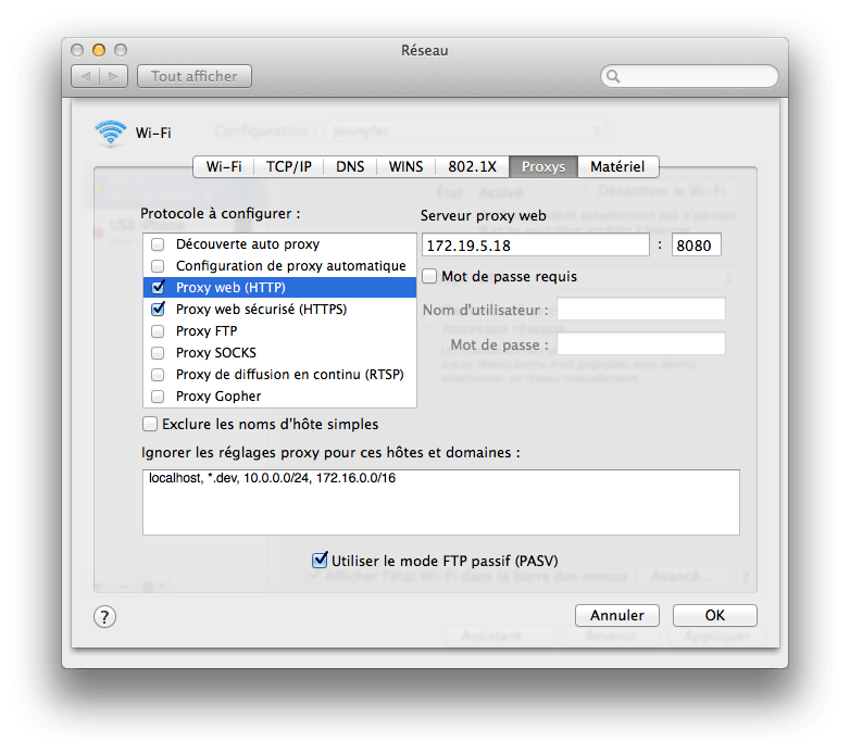 Et le paramétrage de proxy suivant dans Mac OS X :