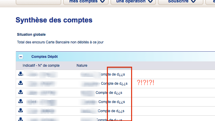 Bon, quand on va sur le site de sa banque, en général, c'est pour consulter ses comptes. Et là, nouvelle surprise[2], les intitulés des comptes ont du plomb dans l'aile :