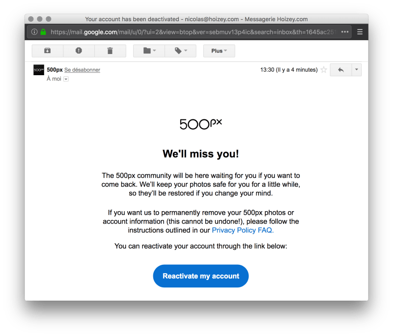 500px e-mail announcing my account has been deactivated